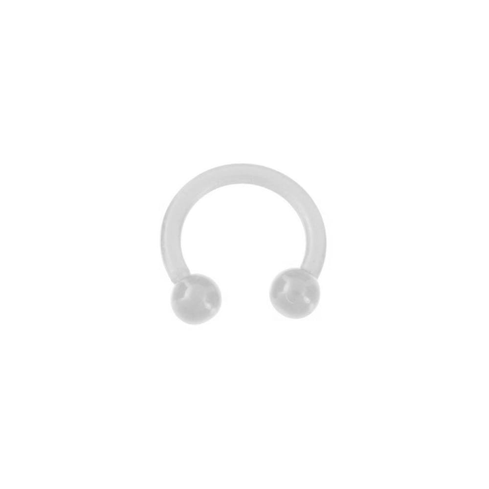 Kolczyk typu podkowa wykonany z przezroczystego akrylu(kulki) oraz bioplastu(pręt).