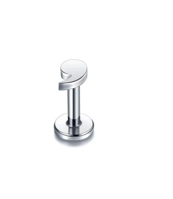 Kolczyk typu labret z gwintem wewnętrznym, wykonany ze stali chirurgicznej 316L z aplikacją w kształcie przecinka.